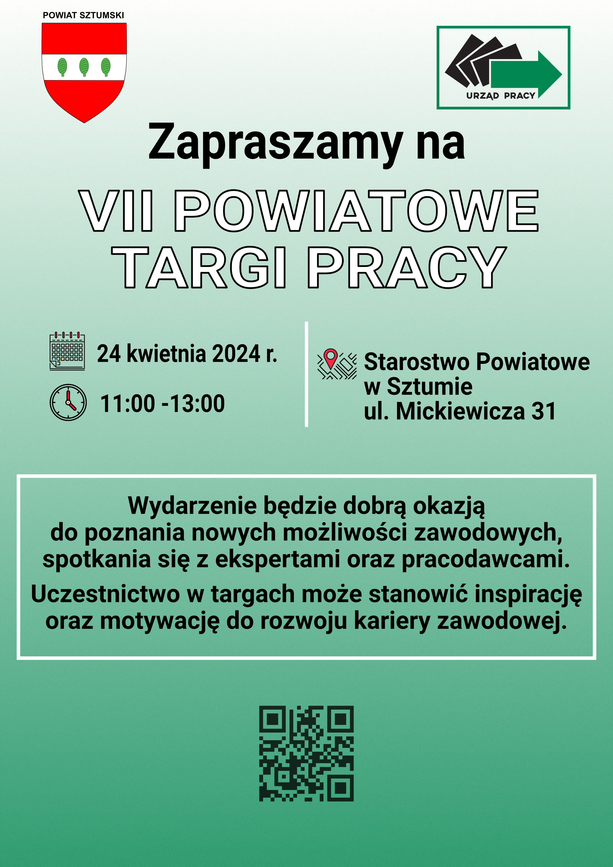 Dyrektor Powiatowego Urzędu Pracy w Sztumie z/s w Dzierzgoniu oraz Starosta Sztumski serdecznie zapraszają do udziału w kolejnej edycji targów pracy. VII POWIATOWE TARGI PRACY odbędą 24 kwietnia 2024 roku w godz. od 11:00 do 13:00 w Sali Starostwa Powiatowego w Sztumie przy ul. Mickiewicza 31. Targi pracy to doskonała okazja do bezpośredniego kontaktu pracodawców bądź ich przedstawicieli z potencjalnymi kandydatami do pracy, prezentacji ofert pracy oraz możliwości pozyskania do pracy pracowników o poszukiwanych kwalifikacjach.